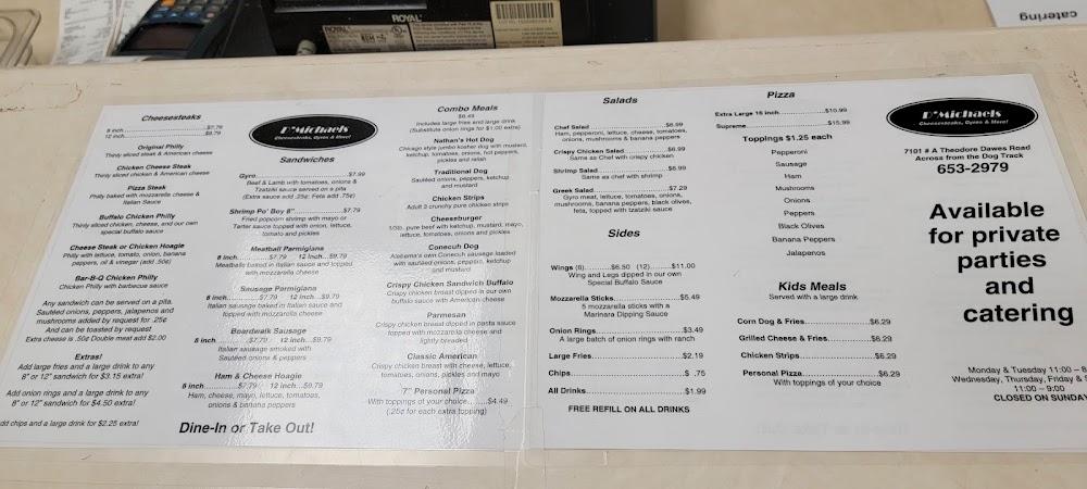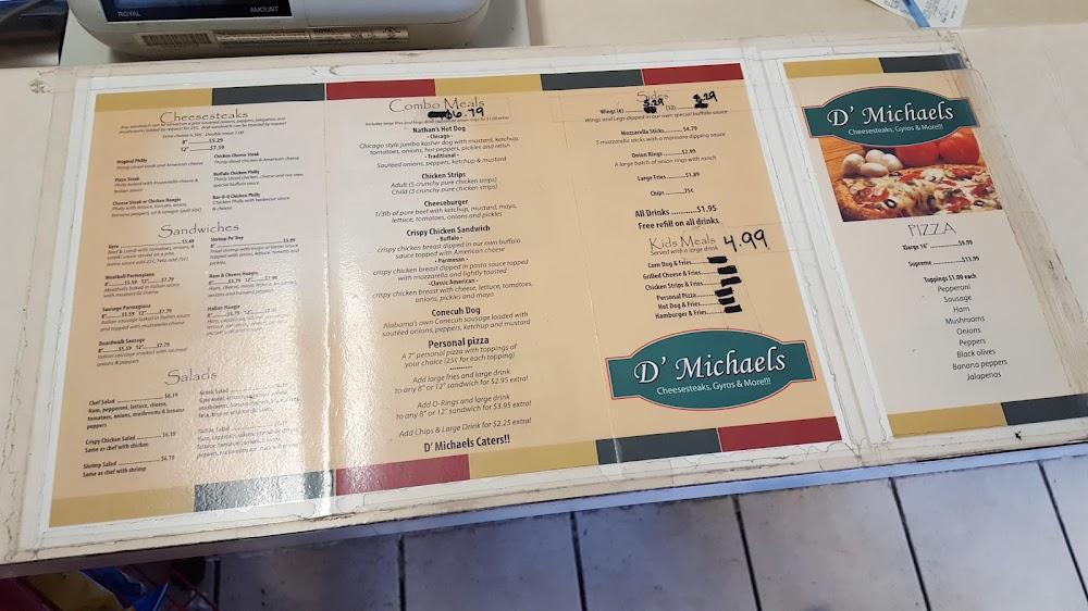 D'Michaels features a diverse menu with a focus on traditional Greek fare and American favorites. Highlight dishes include gyros, cheesesteaks, and sandwiches like meatball and sausage Parmigiana, each made fresh to order.